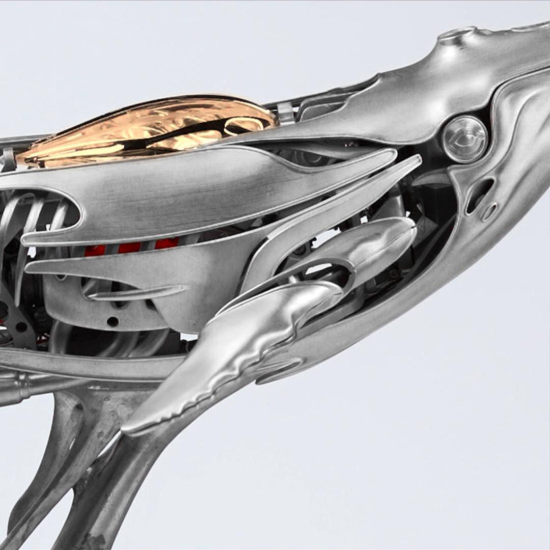 The model features a magnetic shell design, allowing you to remove the outer panels and explore the detailed internal frame that mimics the whale’s rib structure. Every joint, curve, and mechanism has been carefully designed to show the beauty of motion and form. Built from aluminum alloy, zinc alloy, and brass, this is more than a display piece; it's a hands-on tribute to ocean life and mechanical art.