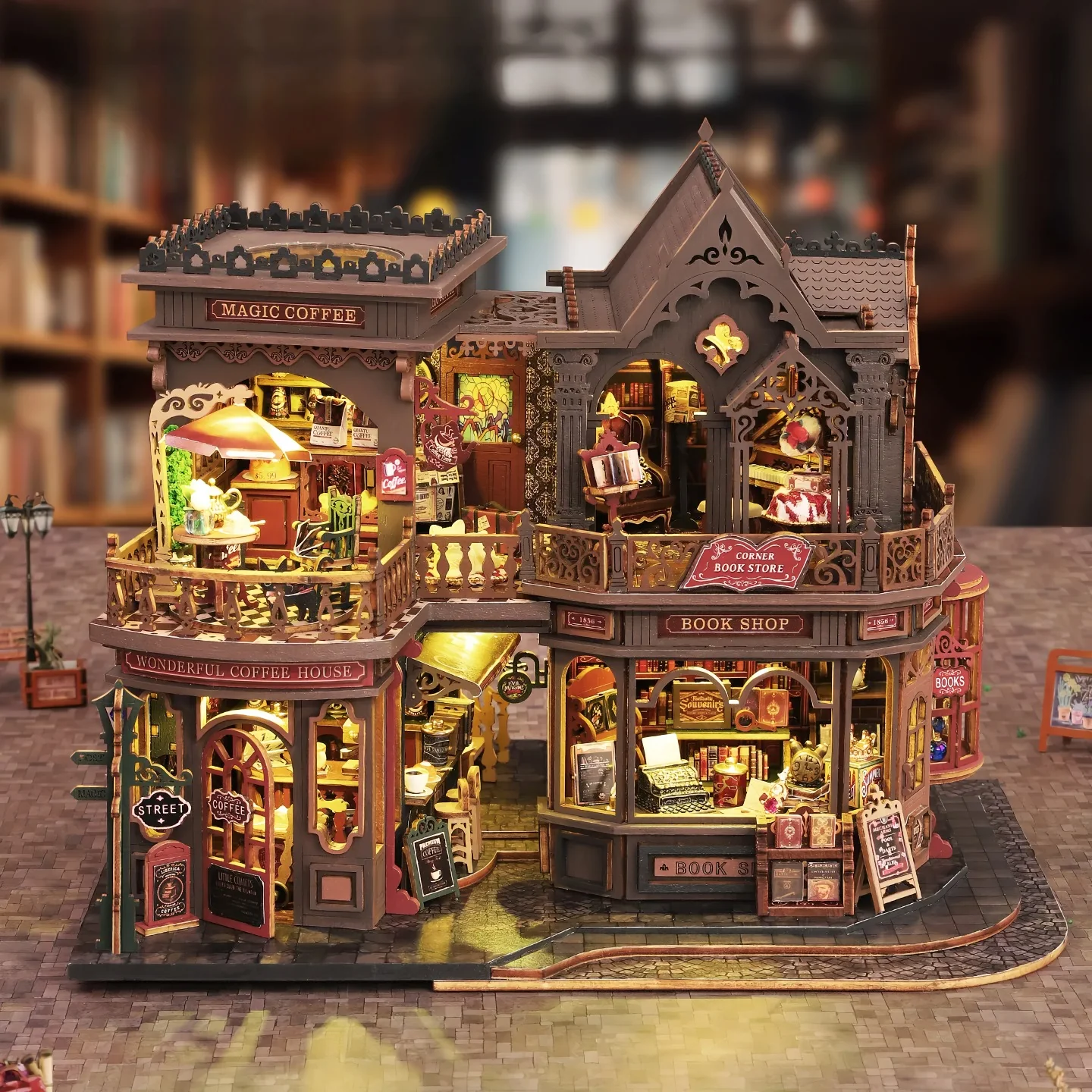 The left building is a coffee house. The first floor serves as a coffee ordering and preparation area, while the second floor includes an open terrace with seating, designed for enjoying coffee and views of the surrounding scene. The right building is a bookstore, marked with a “Corner Book Store” sign. Its first floor displays books and retail details, while the second floor functions as a reading room furnished with a piano and decorative elements. Each area is carefully layered with miniature furniture, signage, and props, offering clear spatial separation and a detailed, well-lit interior structure.