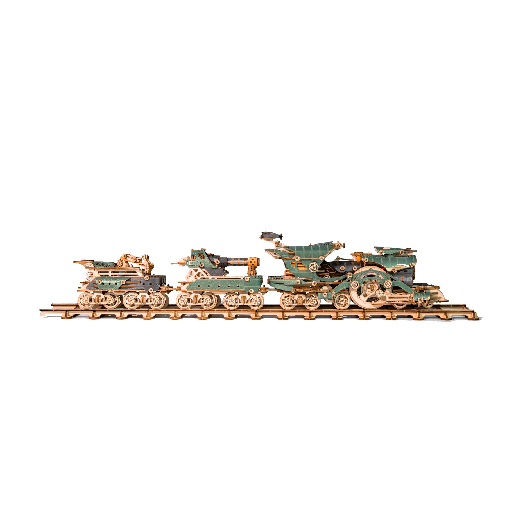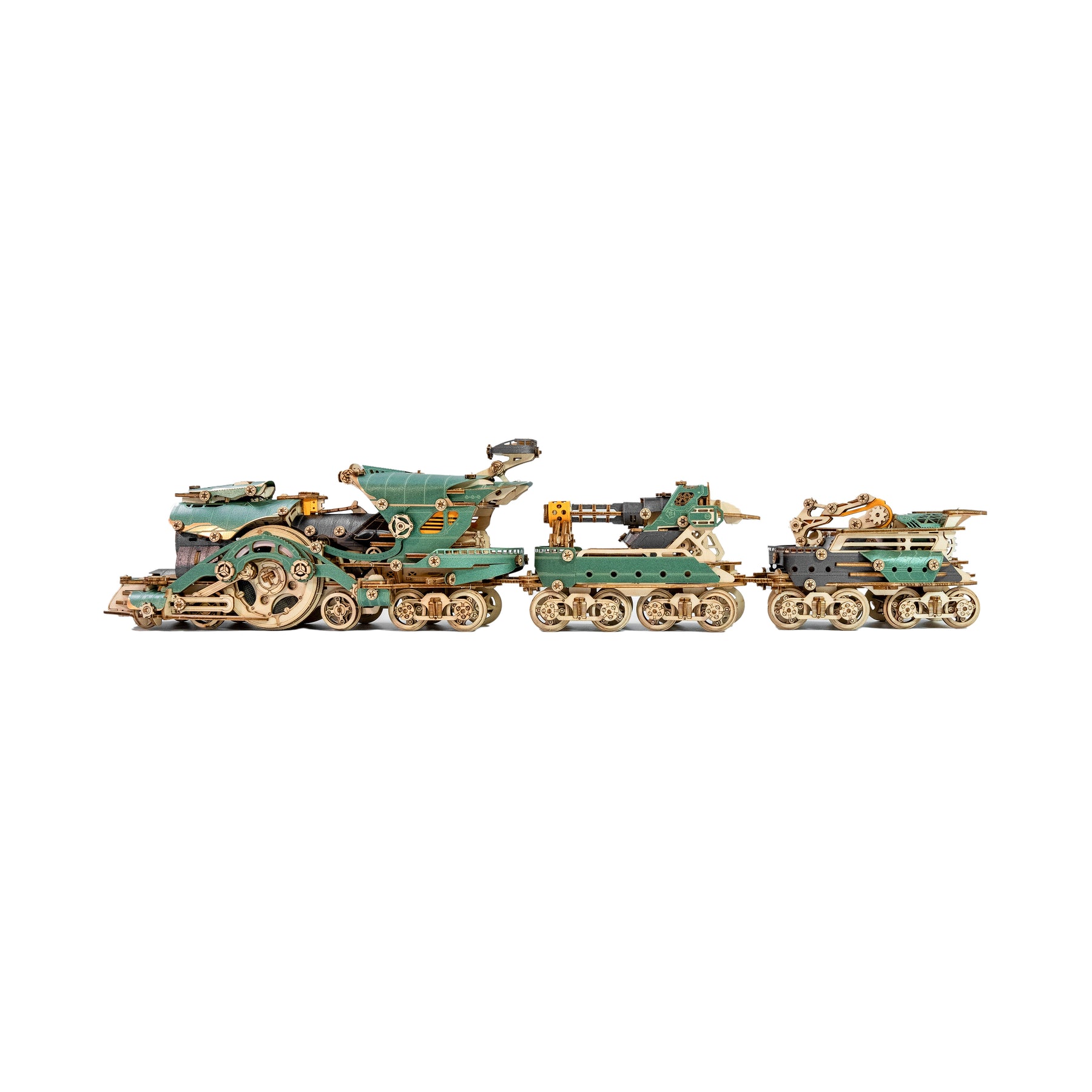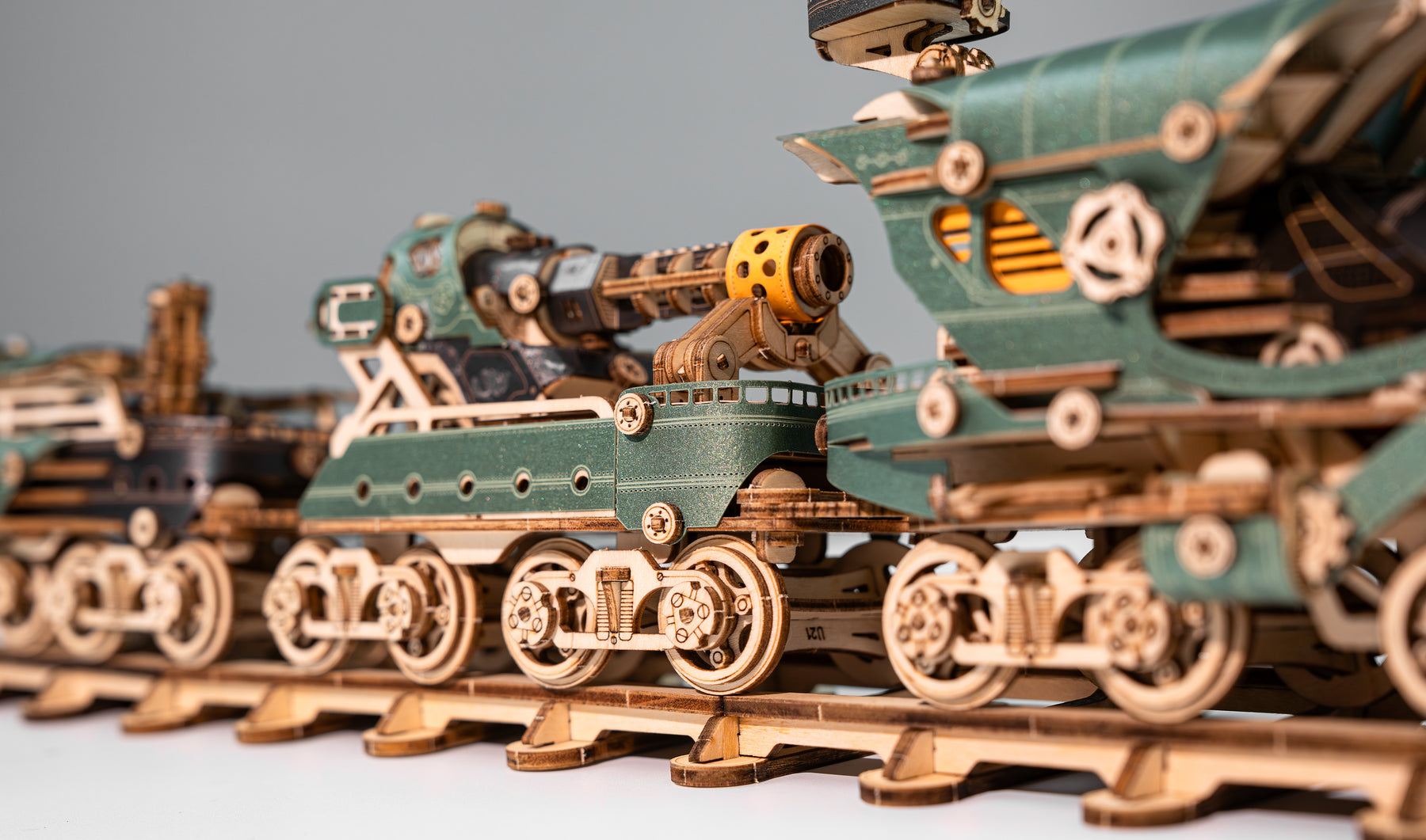 Build an exquisite piece of steampunk engineering with the Fantasy Steampunk Train, a detailed 3-car wooden model kit designed for hands-on builders. Each component is crafted from high-quality wood and finished with a deep-green specialty paper that gives the train a premium, metallic-style appearance.